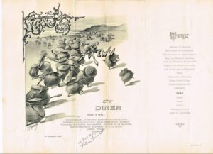 37 - Wilbur WRIGHT (1867-1912), pionnier américain de l’Aviation. Menu signé et daté de sa main, 279ème Dîner de la Marmite du 20 novembre 1908 (40 x 30 cm, pliures d’époque), avec illustration de Gustave Fraipont
