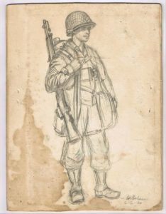 54 - D DAY. 6 JUIN 1944. Extraordinaire témoignage. Dessin autographe signé de George Carl WILHELMS (1913-2001), artiste américain qui deviendra auteur de bandes-dessinées, cartoonist) représentant Samuel FULLER (1912-1997, alors soldat américain et reporter de guerre, incorporé dans le célèbre « Big Red One », qui deviendra réalisateur et scénariste renommé). Dessin original à la mine de plomb (22,5 x 30 cm, mouillure), daté du 6 juin 1944, jour du Débarquement (D Day), attestation dactylographiée au dos