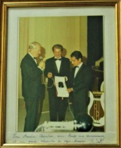 61 - Yves SAINT-MARTIN (né en 1941), jockey vedette. Photographie originale dédicacée et signée de sa main à Maurice Chevalier (17,5 x 24 cm encadrée). La photo a été prise en 1968 lors de la fête d’anniversaire de Maurice Chevalier au Lido. Maurice Chevalier avait été le témoin de mariage d’Yves Saint-Laurent. Le jockey exprime sa « grande admiration au super-champion » sur la marge. Chevalier conservait cette photo dans son bureau à la Louque (provenance vente Chevalier 2013)