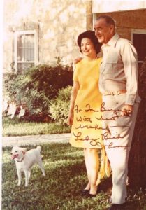 62 - Claudia Bird JOHNSON (1912-2007), First Lady des Etats-Unis de 1963 à 1969. Photographie originale vintage des Années 70 dédicacée et signée de sa main (12,5 x 17,5 cm), elle est en compagnie de son mari le Président Lyndon B. Johnson