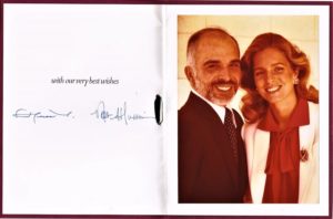 68 - HUSSEIN DE JORDANIE (1935-1999), Roi de Jordanie de 1952 à sa mort. Carte de vœux signée de sa main et de la main de la Reine Noor (sa quatrième épouse, née en 1951, Lisa Najeeb Halaby). Encart (16,5 x 21,5 cm) avec couverture frappée de la couronne dorée et ruban aux couleurs de la Jordanie. Le Roi et la Reine ont signé en regard d'une photographie originale les représentant.