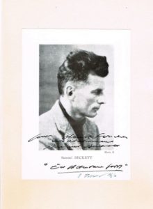 85 - Samuel BECKETT (1906-1989), écrivain irlandais, Prix Nobel de Littérature en 1969. Photo de programme dédicacée et signée de sa main en 1954 (montée sur vergé 15 x 21,5 cm)