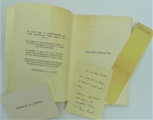 99 - Jean COCTEAU (1889-1963), poète, dessinateur, dramaturge et cinéaste. « Clair obscur » avec envoi autographe signé sur papier libre. Editions du Rocher Monaco 1954, EO brochée, un des 20 exemplaires hors commerce sur papier pur fil Lafuma (XIV sur XX), 200 p in-8, non coupé. Exemplaire enrichi d’un envoi autographe signé de Cocteau sur papier libre (8 x 12 cm) : « Don de Jean Cocteau par les Editions du Rocher de Monaco, 4ème trimestre 1954, absent du Cap-Ferret cet exemplaire de luxe à Pierre Borel ». Joint : la carte de l’éditeur