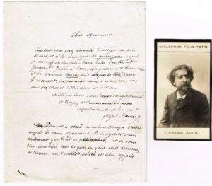 109 - Alphonse DAUDET (1840-1897). Lettre autographe signée en 1871 à François Buloz, le directeur de « La Revue des Deux Mondes », 1 p in-12. Il se rappelle à lui pour rédiger une de ses « Chroniques de quinzaine » : « Grace à Dieu, la guerre est terminée et les éternels turcos mis un peu de côté pour le moment, on pourrait donc s’occuper un peu de choses littéraires et autres » [Daudet devait reprendre ce terme de « turco », tirailleur algérien, dans sa nouvelle « Le Turco de la Commune » parue dans les « Contes du Lundi ». Joint : petite photo de la Collection Félix Potin