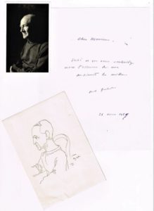 134 - Marcel JOUHANDEAU (1888-1979), écrivain. Lettre autographe signée de 1957 (1 p in-4), photographie originale (8,5 x 13,5 cm). Joint : illustration tirée d’un livre, portrait par Cocteau
