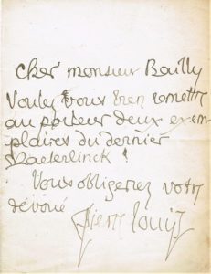 143 - Pierre LOUYS (1870-1925). Lettre autographe signée, 1 p in-8, à Edmond Bailly, l’éditeur des Symbolistes. Il lui demande de remettre au porteur « deux exemplaires du dernier Maeterlinck » [Maurice Maeterlinck, écrivain belge symboliste, Prix Nobel de Littérature en 1911]