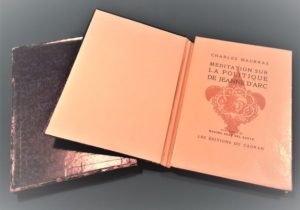 148 - Charles MAURRAS (1868-1952), écrivain figure de proue de l’Action Française. « Méditations sur la politique de Jeanne d’Arc » avec double envoi autographe signé : de Charles MAURRAS et de l’illustrateur Maxime REAL DEL SARTE, Très bel exemplaire en parfait état de fraicheur, Ed. du Cadran, 1931, EO, 1 des 30 exemplaires « Montval », broché, 81 p in-4, illustrations de Réal del Sarte (sculpteur et illustrateur, fondateur des Camelots du Roi, 1888-1954). Rare