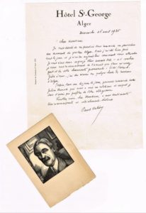 172 - Paul VALÉRY (1871-1945), écrivain, poète et philosophe. Lettre autographe signée, 1 p in-4, de l’Hôtel St-Georges à Alger, 26 avril 1936.Il veut exprimer à son correspondant combien il lui est reconnaissant de son accueil et de cette « charmante promenade à Sidi Ferruch », « grâce à vous, j’ai du moins vu quelque chose des environs d’Alger ». Il ne manquera pas de remercier Julien Monod de l’avoir mis en relation avec lui [Paul Valéry avait débarqué le 21 avril 1936 à Alger, pour donner une conférence et participer à une rencontre avec des écrivains algériens. Trois jours avant l’écriture de cette lettre, il avait commencé un carnet, qui n’allait paraitre que post-mortem : « Les Principes d’anarchie pure et appliquée ». Le banquier Julien Monod était le fidèle ami de Valéry]. Joint : gravure par Ouvré de 1931
