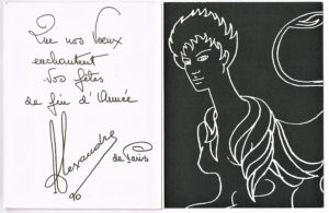 178 - ALEXANDRE DE PARIS (Alexandre Raimon dit, 1922-2008), le coiffeur du Tout-Paris. Carte de vœux autographe signée, la carte (encart de 4 p in-8) est une conception de Jean Cocteau