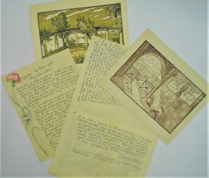 179 - Ferdinand BAC (1859-1952), écrivain et dessinateur. Correspondance de 4 lettres autographes signées (totalisant 11 p grand in-8), sur son papier à lettre illustré, Les Colombières à Menton, janvier à avril 1937, à Madame Halphen, la veuve du compositeur Fernand Halphen, une lettre avec le dessin d’un œillet