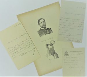 181 - BENJAMIN-CONSTANT (Jean-Joseph Constant dit, 1845-1902), peintre et graveur. Ensemble de 3 lettres autographes signées, 2 p in-8 et 1 p in-12. Joint : encart de l’album Mariani et avis d’article