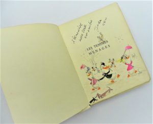 211 - Jean MORAL (1906-1999), photographe et peintre. Dessin original et envoi autographe signé sur « Les Tendres Ménages », texte de P.J. Toulet et aquarelles de Jean Moral. Rombaldi, 1944, EO, broché avec couverture rempilée, 232 p in-8, un des quelques exemplaires hors commerce annoncés. Charmante scène humoristique aux canards datée de 13 juin 1946