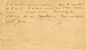 214 - Ludovic-Rodolphe PISSARO. Carte-pneumatique à son père Camille Pissaro. Ludovic-Rodolphe (1878-1952), surnommé Rodo, est un peintre et graveur. Ce 5 décembre 1901, il envoie un message important à son père : « Je ne rentrerai pas pour dîner – Voici le résultat de la vente. La Batterie mise à prix 1500, vendu 3030 – Monet 4000. Beaucoup de Lebourg et de Vogler – Pas un seul petit Jean » [Rodo, il signe d’ailleurs ici d’un simple « R », fait allusion à la vente aux enchères d’un tableau de son père : « La Batterie à Montfoucault ». Il donne le résultat d’une toile de Claude Monet, précise que de nombreux tableaux d’Albert Lebourg et Paul Vogler ont été vendu – Quant au « petit Jean » dont aucune œuvre a été vendue, il s’agit vraisemblablement de Jean Peské, alors jeune peintre élève de son père »