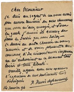 216 - Pierre PUVIS DE CHAVANNES (1824-1898), peintre. Lettre autographe signée à Jérôme Doucet, 1 p in-8 plus page d’adresse, 14 janvier 1894. « Je suis au regret de ne vous avoir pas encore remercié des vers charmants que vous m’avez envoyés, et pour lesquels j’aurais été heureux de faire le dessin que vous désirez. Je serais en outre charmé de vous recevoir et de vous promettre mon concours, si des circonstances imprévues ne m’enlevaient en ce moment tout loisir et toute liberté »