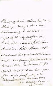 227 - PHOTOGRAPHIE. William Henry Fox TALBOT (1800-1877), scientifique britannique, pionnier de la photographie. Lettre autographe signée, à Julie Chesnay (née Foucher), la sœur de Madame Victor Hugo, gouvernante de Victor Hugo dans à Hauteville-House à Guernesey, vers 1866, 1 p in-8 : « Plaignez moi chère Madame Chenay, car je suis bien malheureux, il m'était impossible de profiter de l'aimable invitation que Monsieur Victor Hugo et Madame Drouet ont bien voulu me faire par votre entremise. En même temps qu'ils soient bien sûr que j'en suis profondément reconnaissant. Tout à vous ma chère Dame » [On sait que Victor Hugo, surtout à Guernesey, s'est passionné pour la photographie]