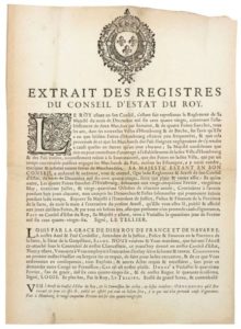 1686. (MOSELLE). FOIRES de BITCHE (57) et de HOMBOURG (57) nouvellement réunis à sa Souveraineté – Extrait des registres du Conseil d’Etat du Roy, Fait à Hombourg le 25 Février 1686 – concernant « l’établissement de 2 Marchés par semaine et 4 Foires franches, tous les ans, dans ses nouvelles Villes de Hombourg et Bitche… » signé (impr.) LE TELLIER - Vignette Royale et Lettrine. Placard (38 x 28) État B
