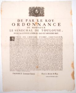 1690. TOULOUSE (31) & Pays ALBIGEOIS (81). NOBLESSE - “De par le Roy. Ordonnance de Louis de CRUSSOL D’UZEZ, Chevalier, Comte d’AMBOISE, Sénéchal de TOULOUSE & Pays ALBIGEOIS, pour la Convocation du BAN et Arrière-Ban.” Donné à Toulouse le 3 avril 1690 - Vignette & Lettrine. Placard (48 x 37) État B