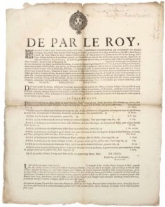 ORLÉANS (45). 1692. TARIF DES CRIES PUBLIQUES - DE PAR LE ROI, Copie à la requête de Nicolas VERIEN, Bourgeois de Paris, pourvu des deux Charges de JURÉS-CRIEURS de la Ville et Faubourg d’ORLÉANS, et le TARIF arrêté par Jean DE CREIL, Marquis de CREIL & Bournezeau Intendant de la Ville et Généralité d’ORLÉANS : Pour les Cris du Pain au rabais, Blés, Nettoyement des rues, Levée de Soldats, Ports d’armes, Affiches, Cris des choses perdues, Cris de Monitoires, Publication des Enchères, etc... - Fait et Arrêté à ORLÉANS, le 29 mars 1692. Placard (51 x 40) État B