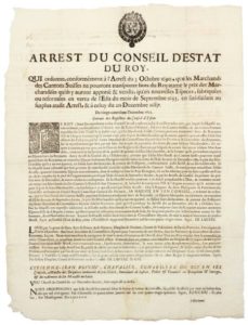 DAUPHINÉ & SAVOIE. 1694. MARCHANDS DES CANTONS SUISSES. MONNAIES. « Arrest du Conseil d’Etat du Roy, du 29 Décembre 1693, qui ordonne, conformément à l’Arrêt du 3 Octobre 1690, que les Marchands des Cantons Suisses ne pourront transporter hors du Royaume le prix des Marchandises qu’ils y auront apporté & vendu, qu’en nouvelles Espèces, fabriquées ou réformées en vertu de l’Edit du mois de Septembre 1693,… » fait à GRENOBLE (38) ce 14 Janvier 1694. Placard (46 x 35) État A
