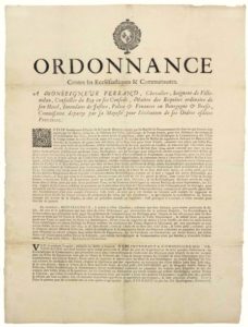 CÔTE D’OR. 1695. BOURGOGNE & BRESSE. – Ordonnance de Monseigneur FERRAND Intendant en bourgogne et Bresse, « contre les Ecclésiastiques & Communautés. » . Vu la requête Charles de LA COUR DE BAUVAL, chargé par Sa Majesté du recouvrement des sommes,… pour être déchargés du rachat des affranchissements des Cens, rentes & autres DROITS SEIGNEURIAUX. Fait à DIJON (21) le 1er Décembre 1695. Placard (47 x 35) État A.