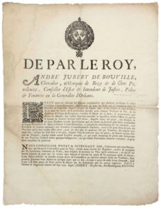 LOIRET. 1700. COURTIERS EN VINS des Élections d’ORLÉANS (45) & de BEAUGENCY - De par le Roy LOUIS XIV, Ordonnance d’André JUBERT DE BOUVILLE, chevalier, Marquis de BIZY & de CLERE PANILLEUZE, Conseiller d’État & Intendant en la Généralité d’Orléans - Fait à ORLÉANS (45) le 29 Janvier 1700. « Le Roy étant informé des sommes considérables que plusieurs personnes se disants Courtiers Commissionnaires, percevaient de tous les Vins qui se vendaient dans les Paroisses de Vignoble. Jugea à propos, en l’année 1691, de les ériger en titre d’Office, & de fixer les droits qu’ils pourraient prendre pour chaque Tonneau de vin, et les Elections d’ORLÉANS & de BEAUGENCY, voulant se libérer de ce Droit, se pourvurent par devers Sa Majesté, qui voulut bien leur accorder la suppression desdits Offices en payant la somme de 78.000 Livres…. Cependant quelques particuliers se disants Courtiers Commissionnaires, y perçoivent actuellement sur les vendeurs… » Vignette Royale & Lettrine - Placard (47 x 36) État B