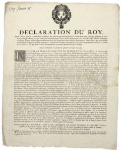 1707. METZ (57) . Déclaration du ROY LOUIS XIV, donnée à VERSAILLES le 15 Janvier 1707, suivi de l’Ordonnance de Dominique DE BARBERIE, chevalier, Seigneur de SAINT CONTEST, intendant en la Généralité de METZ, Frontières de CHAMPAGNE, du LUXEMBOURG, & de la SARRE. Fait à METZ le 17 février 1707 – Réglementation des gages et appointements des Commissaires ordinaires des Guerres, suivant le financement de leurs charges – Vignette et Lettrine. Placard (42 x 33) État B