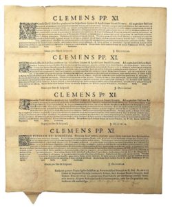 1712. 4 BULLES du PAPE CLÉMENT XI (J. Fr. Albini ; 1649-1721) – « CLEMENS PP. XI », datées de Rome Avril 1712. en latin. Lettrines, Sceau sous papier et signature manus. Placard (44 x 38) État B