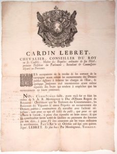 PROVENCE. 1715. Avis de CARDIN LEBRET Intendant et Commissaire départi en Provence, fait à AIX (13) le 27 Octobre 1715. « Les occupations de la récolte & les travaux de la campagne ayant ralenti les recouvrements des Deniers publics destinés à soutenir les charges de l’État, & quelques personnes mal intentionnées ayant même répandu le bruit qui tendent à empêcher que les recouvrement ne soit continués. Nous, ayant reçu sur ce sujet les ordres de S.A.R. Monseigneur le Duc d’ORLÉANS Régent du Royaume, ordonnons… » Placard (47 x 35) État B