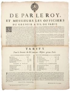 1717. GRENIER A SEL DE PARIS & GABELLE - « De par le Roy, et Messieurs les Officiers du Grenier à Sel de Paris. » « TARIF pour la revente du Sel, tant aux mesures qu’aux poids. » Fait et donnée au Bureau du Grenier à Sel de PARIS, le 17 Février 1717 – Vignette & Lettrine - De l’Imprimerie de Jacques VINCENT – Placard (53 x 41) État B