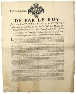 AVEYRON. 1719. ÉLECTION DE MILLAU (12). « De par le Roy, Jean-Baptiste Louis LAUGEOIS, Conseiller du Roy, Intendant en la Généralité de MONTAUBAN » « Avons fixé le Prix des Denrées (Pain, Vin, Viande, Bois & autres) pour les Lieux d’Étape (des Gens de Guerre), pendant les mois de Janvier, Février & Mars prochain savoir : Pour la Ville de MILLAU, de ST-AFFRIQUE, de NANT, de CORNUS, pour ST SERNIN (SUR RANCE), Pour VEZINS, Pour LA CLAUX, pour ESPALION,… » . Fait à MONTAUBAN (82) le 15 Décembre 1719 – Vignette Royale. Placard (48 x 39) Etat B
