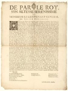 POLICE D’ORLÉANS (Loiret). 1725. BOUCHERIE. « De par le Roy, Arrêté de Gorge VANDEBERGUE, Lieutenant Général de Police d’Orléans, assisté des autres Officiers, juges audit Siège, assemblés le 26 Novembre 1725, portant règlement du prix des Chairs qui se vendent dans les Boucheries de la Ville… défense aux Bouchers de cette Ville, à peine de 1000 Livres d’amende, de vendre la Viande de Boucherie à un plus haut prix que ceux cy-après ; Savoir : les deux quartiers de derrière des Bœufs, Veaux & Moutons, six sols la livre ; les quartiers de devant quatre Sols la livre… Enjoignons audits Bouchers de fournir séparément des Chairs de Bœuf, Veau & Mouton à ceux qui n’auront besoin que d’une ou deux desdites espèces… ». Placard (49 x 37) État B