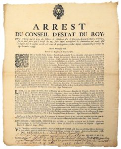 1726. HAYNAUT. MONNAIE D’OR & D’ARGENT. Arrest du Conseil d’Estat du Roy, qui ordonne que le prix des Espèces & Matières d’OR & d’Argent, demeurera fixé à toujours, sur le pied porté par l’arrest du 15 Juin 1726...” – du 11 Novembre 1738. Vu et exécuté par Jean MOREAU Intendant de la Province du Hainault, Pays d’entre Sambre & Meuse & d’outre Meuse. Note manus. “Distribué à CHARLEMONT..”. Vignette et Lettrine. Placard (40 x 33) État A