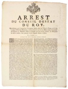 PARIS. 1727. CHANGE DES MONNAIES & MATIERES D’OR & D’ARGENT. « Arrest du Conseil d’Etat du Roy, du 4 Novembre 1727, qui ordonne qu’à l’avenir les CHANGEURS établis dans les Villes & Lieux où il n’y a point d’Hôtel de Monnoye, seront tenus de recevoir au Marc toutes les anciennes espèces & Matières d’Or & d’argent qui leur seront portées, & d’en payer la valeur entière, sans pouvoir retenir aucuns droits ni salaire. ». Paris le 12 Novembre 1727. Placard (52 x 39) État A