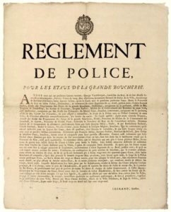 ORLÉANS (Loiret). 1729. « RÈGLEMENT DE POLICE POUR LES ÉTAUX DE LA GRANDE BOUCHERIE. » 21 Avril 1729 – « …George VANDEBERGUE, Conseiller du Roy, & de S.A.S. Mgr, premier Prince de Sang, Duc D’ORLÉANS, lieutenant Général de Police de la Ville, Foubourg & Banlieue d’Orléans… ». « … Il sera procédé au Bail à Ferme des 21 Etaux vacants, pour être adjugés le même jour,… au plus offrant & dernier enchérisseur qui voudront vendre et débiter des Chairs jusqu’au Carême prochain… ». Vignette aux armes. Placard (47 x 37) État A