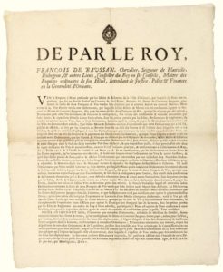 1732. GÉNÉRALITÉ D’ORLÉANS (45). DROITS SUR LES VINS . “De par le ROY, François DE BAUSSAN, Chevalier, Seigneur de BLANVILLE, RICHEGROU, & autres Lieux, Conseiller du Roy, Intendant de Justice, Police & Finances en la Généralité d’ORLÉANS.” (Entête). “... Ordonnons, qu’en conséquence, les Droits de COURTIERS-JAUGEURS seront payés, même pour les VINS, qui vendus, devront être consommés sur les lieux sans déplacement, à l’égard desquels il sera fait déclaration, & les Droits seront acquittés dans la huitaine, conformément à notre dite Ordonnance. Fait à ORLÉANS (45) le 14 Août 1732. Vignette. Placard (46 x 37) État A.