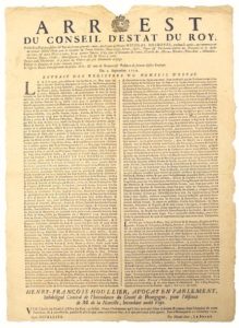 1732. BOURGOGNE. Arrest du Conseil d’État du Roy pour la Prise de possession du Bail des FERMES-Générales unies, sous le Nom de Maître NICOLAS DESBOVES, pendant six années... pour les Grandes & Petites Gabelles, Cinq grosses Fermes, Papier & Parchemin timbrés des Provinces où les Aydes ont cours, & autres Droits...”. Ordonnance d’HOULLIER Avocat en Parlement Subdélégué Général de l’intendance du Comté de BOURGOGNE. Fait à BESANÇON (25) le 11 Octobre 1732. (petite déchirure d’affichage sans manque). Placard (53 x 38) État B+