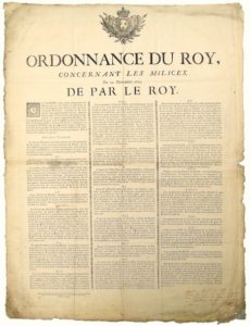 FLANDRES. 1733. « Ordonnance du Roi concernant les MILICES, du 12 Novembre 1733. Il sera levé dans les Provinces et Généralités du Royaume, trente nouveaux Bataillons de Milice de 684 hommes chacun, pour, avec les 93 Bataillons qui sont actuellement sur pied, faire leur nombre de 123 Bataillons… chaque Bataillon sera composé de douze Compagnies & chacune d’un Capitaine, un Lieutenant… » signé LOUIS XV & BAUYN – Vignette. Impr. à LILLE (59) chez Crame. Placard (62 x 46) Etat B.