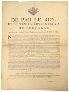 1737. BRETAGNE . ST JULIEN DE VOUVANTES (Loire Atlantique). « De par le Roy, et de Nosseigneurs des Etats de BRETAGNE. » Mandement pour la levée des Foüages extraordinaires de l’année 1738. Placard (51 x 38) complétée à l’encre. État A.