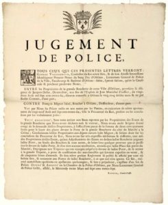 LOIRET. 1737. LA GRANDE BOUCHERIE D’ORLEANS (45). « Jugement de Police, entre les Propriétaires de la Grande Boucherie d’Orléans, contre François MIGNOT l’aîné, boucher à Orléans – Défense aux propriétaires des Étaux de la Grande BOUCHERIE joignant la Porte de la Grande Boucherie, du côté du Marché à la Crème , au Sindic des Bouchers, de louer le devant de ladite Porte & d’en tirer aucune rétribution, attendu que ladite Place fait partie du marché ; Enjoignons aux Tripières qui ont occupés jusqu’ici le devant de ladite porte, de se retirer à la Grande Triperie, à peine de confiscation de la Marchandises, & de 50 livres d’amendes… » . Donné & arrêté en la Chambre de Police d’Orléans, le 13 Mars 1737 – Vignette & Lettrine. Placard (46 x 37) État A