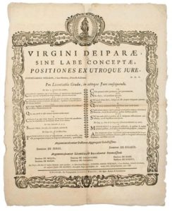 TOULOUSE (31). 1738 – Affiche avec bel encadrement gravé sur bois et image de la Vierge entête, de l’Imprimeur TOULOUSAIN Joseph DALLES – TOULOUSE le 7 Juillet 1768. Texte en latin. Jean Marie MOILHAN, présentera ses thèses de Droit à la Chancellerie de Toulouse, afin d’obtenir le grade de licencié. – (qq. petits manques). Placard (47 x 38) État B.