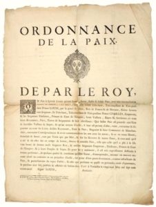 1739. CAEN (14). « ORDONNANCE DE LA PAIX. » entre LOUIS XV et l’Empereur CHARLES VI (Le Traité de VIENNE (1738), mit fin à la Guerre de Succession de POLOGNE). Fait à VERSAILLES (78) le 28 May 1739 – “On fait savoir à tous, qu’une bonne, ferme, stable & solide Paix, avec une réconciliation entière & sincère, a été faite & accordée entre très-haut, très-excellent & très-puissant LOUIS Roy de France & de Navarre, & très-haut, très-excellent & très-puissant Prince CHARLES Empereur, & les Seigneurs Électeurs, Princes & États de l’Empire...” – Vignette royale et Lettrine. Impr. à CAEN, chez Antoine Cavelier, seul Imprimeur du Roy, et Jean Claude Pyron, reçu en Survivance. Placard (52 x 39) État C