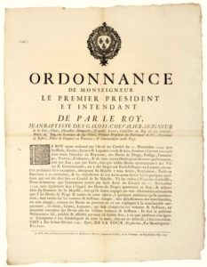 1740. PARLEMENT D’AIX EN PROVENCE (13). DROITS DE PÉAGE SUR LES GRAINS & LÉGUMES – Ordonnance de Mgr Jean Baptiste DES GALOIS, Seigneur De LA TOUR, le 1er Président du Parlement d’AIX, et Intendant de Provence, fait à AIX (13) le 8 Février 1740 – « Le Roy ayant ordonné par l’arrêt du Conseil du 10 novembre 1739, que les Blés, grains, Farines, & Légumes verts & secs, seront à l’avenir exempts dans toutes l’étendu du Royaume, des Droits de péage, Passage, Pontonnage, travers, Coûtumes & autres Droits généralement quelconques, tant par eau, que par terre… ». Vignette Royale & Lettrine. Placard (51 x 40) État B