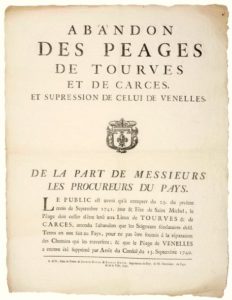 PROVENCE. 1741. Abandon des PÉAGES FÉODAUX de VENELLES (13), TOURVES (83) & CARCES (83) : « De la part de Messieurs les procureurs du Pays. Le Public est averti qu’à compter du 29 Septembre 1741, jour de la fête de Saint Michel, le Péage doit cessé d’être levé aux Lieux de TOURVES & de CARCES, attendu l’abandon que les Seigneurs féodataires desdits Terres en ont fait au Pays, pour ne pas être soumis à la réparation des Chemins qui les traversent ; & que le péage de VENELLES a encore été supprimé par Arrêt du Conseil du 13 septembre 1740. – Vignette – Impr. à AIX (13), chez la Veuve de Joseph DAVID & esprit DAVID, imprimeur du Roy, de M. l’Intendant, du Pays & de la Ville. 1741. Placard (48 x 37) État A