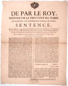 PARIS. 1742. CORPORATION DES CHANDELIERS. « De par le Roy, Mr le Prévôt de Paris ou Monsieur son Lieutenant Général de Police. SENTENCE qui fait défenses à tous les Maîtres Chandeliers de la Ville, Faubourg & Banlieue de Paris, de vendre leur Chandelle au-dessus du prix courant ; Et qui condamne plusieurs Maitresses Chandelières en 300 Livres d’amende, pour y avoir contrevenu. » du 9 Février 1742. De l’Imprimerie de P. J. Mariette, Imprimeur de la Police. 1742. Placard (46 x 36) Etat A.