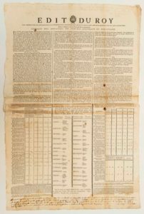 VERSAILLES (78) Février 1748. « Édit du ROY, portant établissement de droits sur la Poudre à poudrer & sur la Cire, & Rétablissement des Droits anciens sur les Suifs & sur les Papiers et Cartons ; comme aussi une augmentation de Droits sur le papier & parchemin timbrés. » « TARIF des Droits que le Roy, en son Conseil, veut & entend être perçus sur les Papiers & Cartons… » « État des Villes où Sa Majesté veut & entend que les Droits soient perçus sur les Suifs, à raison d’un sol six deniers ; & sur les Cires blanches, à raison d’un sol pour chacune livre qui entrera dans lesdites Villes pour y être consommée… » « TARIF des Droits que le Roy veut et entend être perçus sur les Papiers & Parchemins timbrés, & sur la formule des Actes des Notaires de la Ville de Paris… » Placard (82 x 54 cm) Etat B+.