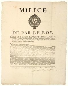 1756. PROVENCE. MILICE. « De par le ROY. » Ordonnance de Charles Jean Baptiste DES GALOIS, premier Président du Parlement, Intendant en Provence ; Fait à AIX (13) le 3 Mai 1756 – Vignette Royale – Présentation d’un Milicien par la Communauté devant le Sieur de LENFANT Commissaire Provincial des Guerres, à peine de 100 Livres d’amende, leur enjoignons de fournir la subsistance aux Miliciens… « Défendons très-expressément aux Miliciens d’en substituer d’autres à leurs places, à peine de 6 mois de prison, & de 10 ans de service dans la Milice au-delà du temps qu’il se trouvera avoir servi, de 3 ans de Galères contre l’homme qui a été substitué, & 500 livres d’amende contre les Maire & Consuls… ». Impr. à AIX (13) chez la Veuve de Joseph David & esprit David, Imprimeur du Roi, & de M. l’Intendant. 1756. Placard (46 x 36) État B