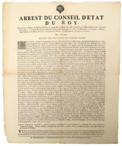 COMMERCE. 1756. DOUANE. “Arrest du Conseil d’État du Roy, qui permet, pendant la présente Guerre, la sortie & transport des Marchandises des Manufactures de la Flandre Française, & l’entrée de matières servant à leur fabrication, par les Ports de BORDEAUX, LA ROCHELLE, NANTES, SAINT MALO & LE HAVRE de Grâce, en payant les Droits, & observant les formalités y énoncées. du 3 Août 1756. Vignette & Lettrine. Exécuté par Louis-Urbain AUBERT Marquis de Tourny, Intendant de la Généralité de BORDEAUX. Impr. à BORDEAUX, chez Simon De La Court, Fils seul Imprimeur du Roy. Placard (47 x 38) État A