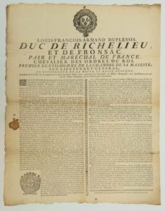 LE MARÉCHAL DUC DE RICHELIEU. 1761. HAUTE & BASSE GUIENNE ; MILICE-BOURGEOISE. « De par le Roi, Louis Armand DUPLESSIS, duc de RICHELIEU et de FRONSAC, Pair & Maréchal de France, Chevalier des ordres du Roi,…, Son Lieutenant-général, & Gouverneur de la Haute & Basse Guienne. » (Son En-tête, Vignettes royale et à ses armes et Lettrine) – BORDEAUX (33), le 10 août 1761. « Ordonnance en supplément à celle du premier juillet 1761, concernant les Patrouilles de Milice-Bourgeoise, avec injonction à eux qui ont des armes indument, de les remettre sans retardement. » Placard (58 x 45,5) Etat B