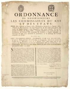 1762. LANGUEDOC. BIENS & DROITS NOBLES. ORDONNANCE de Nosseigneurs Les Commissaires du Roi et des ÉTATS GENERAUX de la Province de Languedoc : DE SAINT PRIEST, + F. Évêque de MONTPELLIER, CAMBACÈRES, Maire de MONTPELLIER, FARGO Maire de CASTRES. 2 Vignettes. à propos de la levée du Vingtième et des deux Sols pour livre, & concernant les Biens Nobles. Impr. à MONTPELLIER, De L'imprimerie de Jean MARTEL, 1762.Placard (58 x 45) État B.