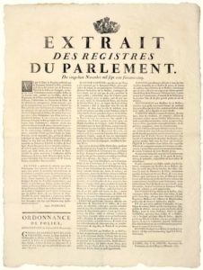 SARTHE. 1765 POLICE DES CABARETS ET DES GARÇONNADES. Extrait des Registres du PARLEMENT du 28 Novembre 1765. Ordonnance de POLICE, concernant les Cabarets et les Garçonnades, donné à SOULIGNÉ-SOUS-BALLON (72) le 15 Janvier 1765. “...plusieurs particuliers s’attroupent et vont armés, tant de jour que de nuit, troublent le repos public; s’assemblent dans les Cabarets pour y boire, manger, jouer ou danser, même les Dimanches et Fêtes, aux heures du Service Divin... courant ça et là au travers le Cimetière ... à peine contre les Contrevenants d’amende et de Prison… ». Impr. à PARIS, chez P. G. SIMON, Imprimeur du Parlement, rue de la harpe, à l’Hercule, 1765. Placard (61 x 46) État A